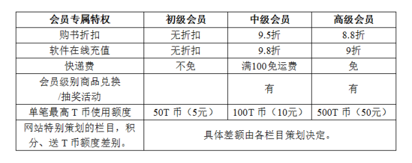 不同級(jí)別會(huì)員可享受隧道網(wǎng)不同特權(quán),除下表中固定的特權(quán)差別外,隧道網(wǎng)各個(gè)欄目將定期或不定期策劃各種與網(wǎng)友互動(dòng)的活動(dòng),每個(gè)活動(dòng)都可根據(jù)自身特點(diǎn)設(shè)定不同的送積分、不同級(jí)別會(huì)員獲得T幣和積分的額度差別由策劃人設(shè)定。