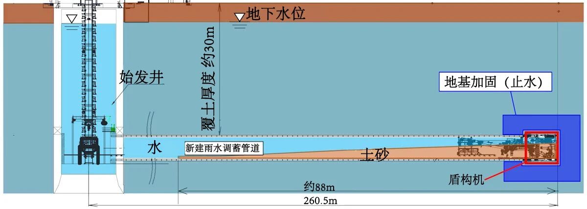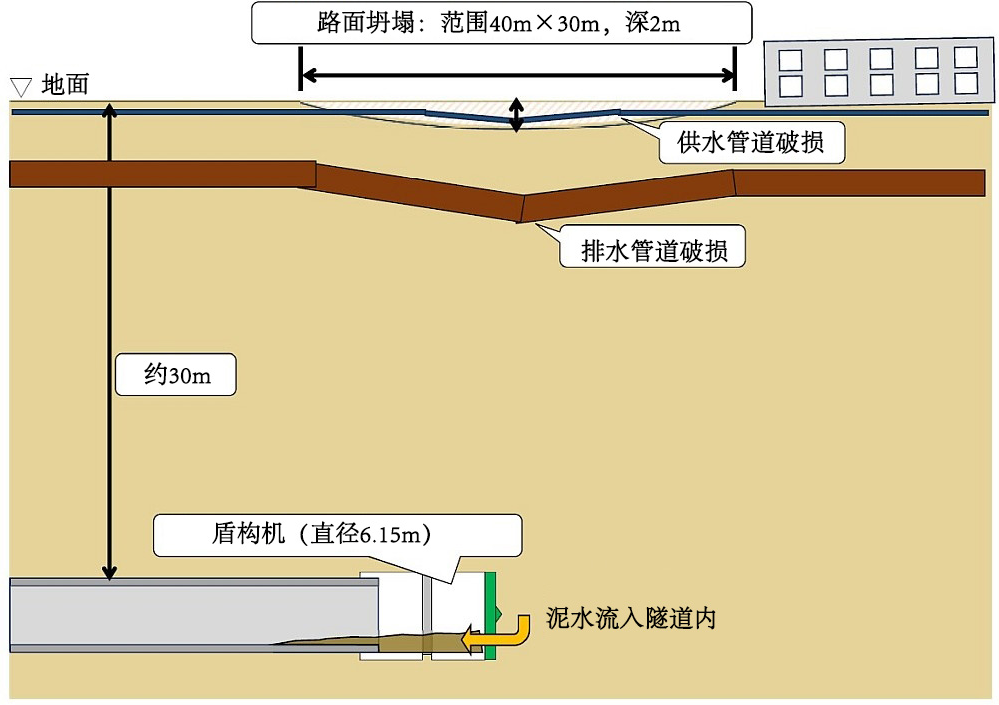 事故發(fā)生于2024年9月26日,由清水建設(shè)、日本國土開發(fā)、廣成建設(shè)組成的企業(yè)聯(lián)合體(JV)承接的市政下水道局盾構(gòu)工程。上午8:45,盾構(gòu)機(jī)前方開始涌入泥水;3分鐘后,地面上方一家運(yùn)輸公司的事務(wù)所開始傾斜。為穩(wěn)定地下水位,施工方于上午9:36開始從始發(fā)井注水。中午左右,隧道頂部被水淹沒。事故發(fā)生時(shí),施工單位正在采用土壓平衡盾構(gòu)法進(jìn)行砂礫層掘進(jìn)。