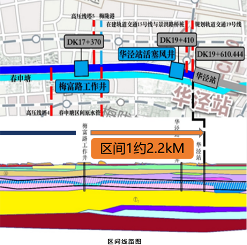 梅富路工作井至華涇站盾構(gòu)區(qū)間全長2183.6米,共計(jì)1092環(huán),由公司自主研制的超大直徑盾構(gòu)“騏躍號”在不同的復(fù)雜土層中,先后穿越高壓鐵塔、虹梅南路高架橋、地鐵15號線,以及錯(cuò)綜復(fù)雜的水務(wù)、燃?xì)?、電力、通信等管道,施工難度較大。