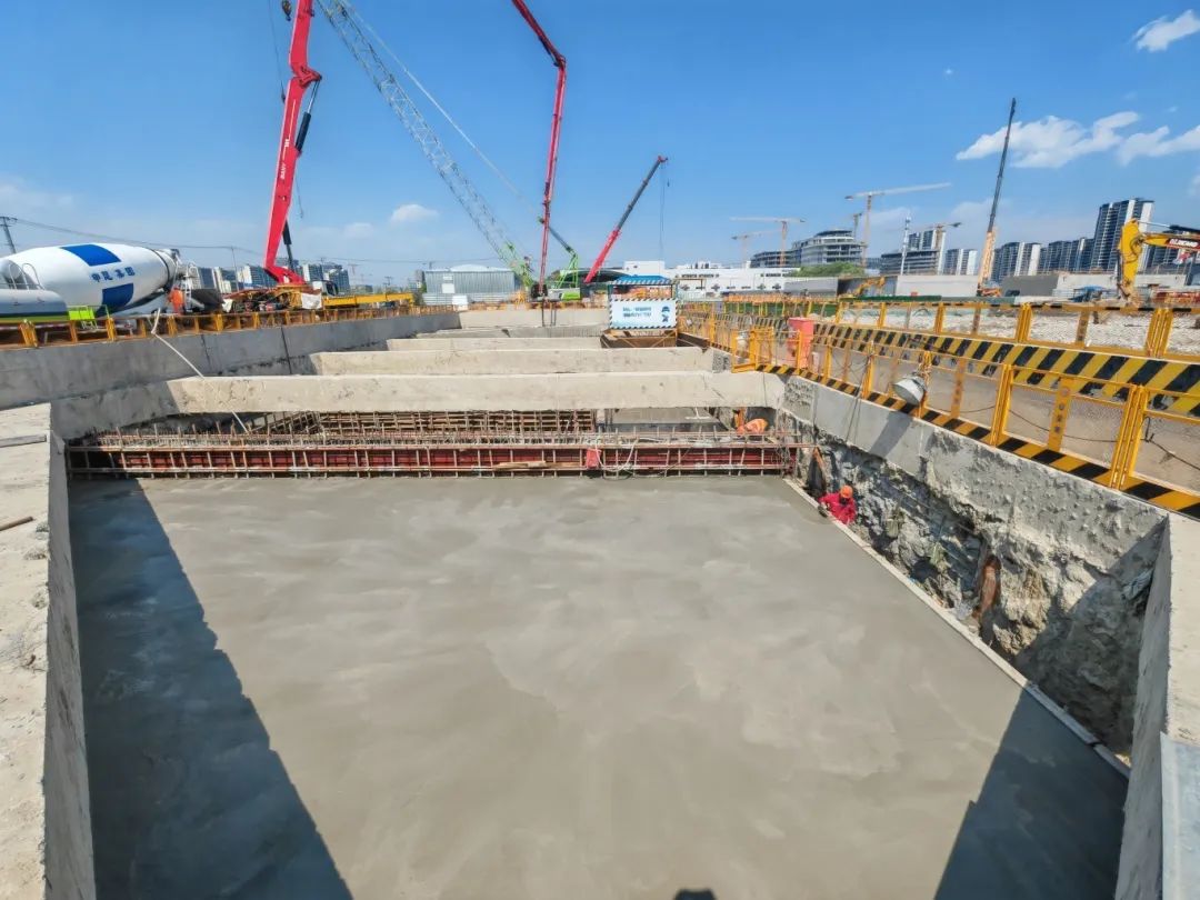 Ⅴ區(qū)位于芳樂路站北端,沿聯(lián)友路南北向布置,主體結(jié)構(gòu)為地下二層單柱雙跨混凝土箱形結(jié)構(gòu),作為全線關(guān)鍵控制性工程,Ⅴ區(qū)承擔(dān)著紀(jì)翟路始發(fā)盾構(gòu)接收井的核心功能,其結(jié)構(gòu)封頂標(biāo)志著紀(jì)翟路站與芳樂路站連通已具備條件,為后續(xù)盾構(gòu)區(qū)間推進奠定了堅實基礎(chǔ)。